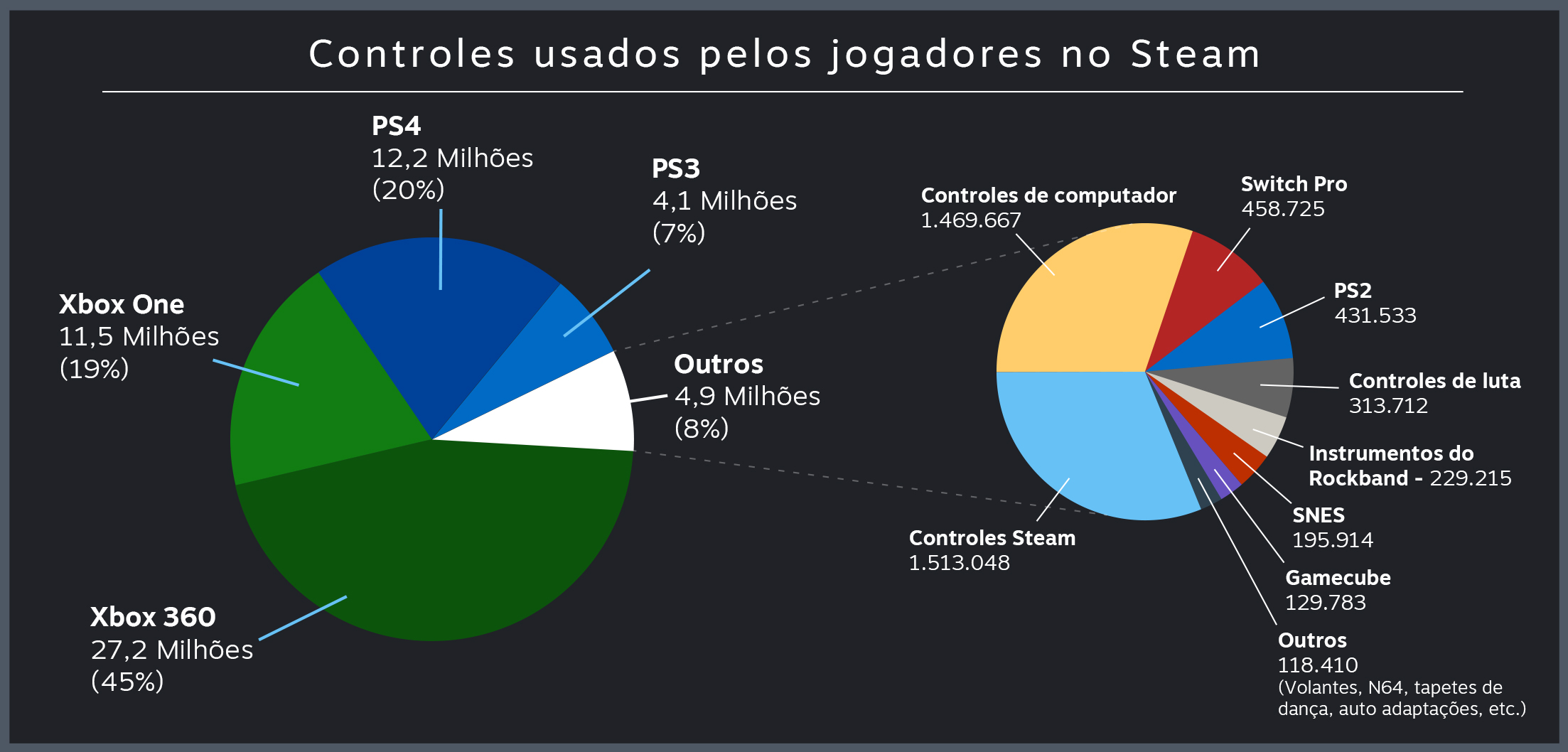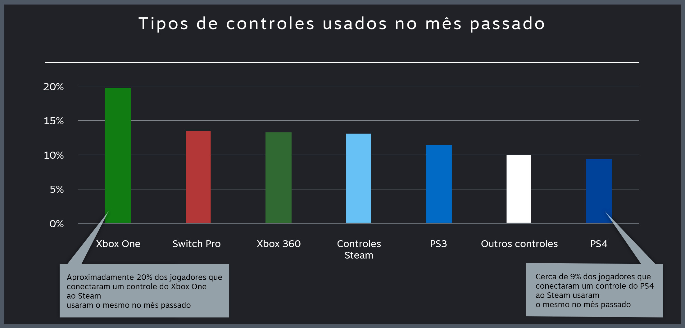 O console PlayStation 4 é extremamente popular e possui um controle muito bom. A razão pela qual o total de 12 milhões nos surpreende é que, historicamente, o controle do PS4 não tem sido tratado com um controle de jogos de computador. A compatibilidade nativa não é comum, por isso, jogadores usam um software que converte a entrada do controle do PS4 na entrada do controle do Xbox. No entanto, isto apresenta alguns inconvenientes. Por exemplo, um jogo pode induzi-lo a pressionar Y para saltar, quando na realidade você deveria pressionar o botão triângulo. Estas transposições mentais podem influenciar fortemente a escolha de alguns usuários por controles do PS4, o que é demonstrado pelos dados de tempo de jogo mensal.