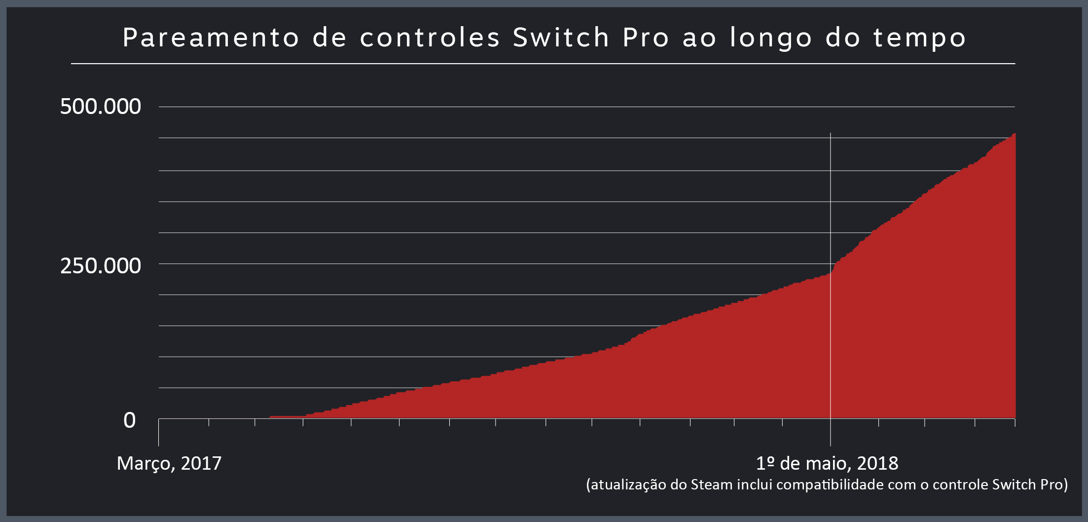 O controle Switch Pro foi lançado em 2017 e, imediatamente, começaram a ser conectados ao seus computadores. Naquela época, a compatibilidade era praticamente limitada ao remapeamento da configuração de controles pelo Steam, ou seja, a interface não se adequava ao dispositivo físico e, alguns recursos, tais como controle de movimento e a vibração, não estavam disponíveis. Em maio de 2018, uma atualização do Steam incluiu um conjunto completo de recursos no dispositivo, adicionou imagens correspondentes à interface e aprimorou a experiência como um todo. O resultado foi um rápido aumento no número no uso de controles Switch Pro, como mostra o gráfico abaixo, o qual passou a ser o sétimo tipo de controle mais popular no Steam.